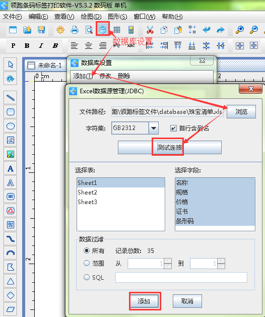 2.數(shù)據(jù)庫導入(即珠寶清單),點擊窗口上方的柱型“數(shù)據(jù)庫設置”按鈕,添加excel數(shù)據(jù)源(珠寶清單為excel表格),“瀏覽”并添加文件后,點擊“測試連接”按鈕,然后“添加”即可。