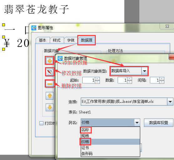 4.1繪制一個普通文本,然后雙擊普通文本,出現(xiàn)圖形屬性窗口,點擊“數(shù)據(jù)源”,點擊左側(cè)的“-”按鈕,刪除原有數(shù)據(jù),然后點擊黃色“+”按鈕,添加新的數(shù)據(jù),數(shù)據(jù)對象類型選擇“數(shù)據(jù)庫導入”,列名選擇“名稱”即可。復制剛完成的普通文本,然后雙擊文本,出現(xiàn)圖形屬性窗口,選擇“數(shù)據(jù)源”,點擊左側(cè)“紅色筆”按鈕,修改文本數(shù)據(jù),列名選擇為“價格”即可。這樣第二部分的內(nèi)容就做好了。
