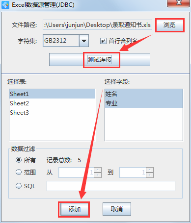 利用左側(cè)工具欄中的“繪制普通文本”按鈕,在空白區(qū)域繪制一個(gè)文本框,雙擊文本框進(jìn)入屬性窗口,選擇“數(shù)據(jù)源”選項(xiàng),按照上述步驟中“數(shù)據(jù)庫(kù)導(dǎo)入”的方法,導(dǎo)入學(xué)生姓名及錄取專(zhuān)業(yè),到此,錄取通知書(shū)就算制作完成了。