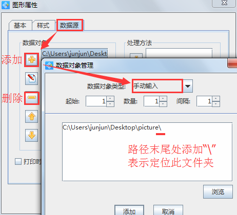 利用軟件左側(cè)工具欄中的“插入位圖圖片”按鈕,在畫(huà)布中錄取學(xué)生的頭像位置繪制出一個(gè)圖形框,雙擊圖形框進(jìn)入圖形屬性窗口,選擇“數(shù)據(jù)源”選項(xiàng),點(diǎn)擊“數(shù)據(jù)對(duì)象”欄中的加號(hào)按鈕,在彈出的數(shù)據(jù)對(duì)象管理窗口中,刪除默認(rèn)數(shù)據(jù)后,點(diǎn)擊加號(hào)按鈕,在彈出的“數(shù)據(jù)對(duì)象管理窗口”中,選擇數(shù)據(jù)對(duì)象類(lèi)型為“手動(dòng)輸入”,在輸入框中粘貼照片所在的文件夾存儲(chǔ)位置,粘貼后在末尾處加一個(gè)“\”,表示進(jìn)入到此文件夾中,完成后點(diǎn)擊“添加”,表示圖片的存儲(chǔ)位置添加完成。