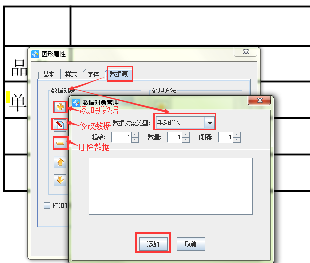 4、繪制完成表格之后,我們要在表格中添加數(shù)據(jù)內(nèi)容。先繪制一個(gè)普通文本,雙擊普通文本,出現(xiàn)“圖形屬性”窗口,選擇數(shù)據(jù)源,點(diǎn)擊左側(cè)“-”按鈕,刪除原有數(shù)據(jù),然后點(diǎn)擊黃色“+”按鈕,添加新的數(shù)據(jù),數(shù)據(jù)對(duì)象類型選擇“手動(dòng)輸入”,內(nèi)容中輸入:“品名:”點(diǎn)擊添加即可,然后復(fù)制剛完成的普通文本,雙擊普通文本,出現(xiàn)“圖形屬性”窗口,選擇數(shù)據(jù)源,點(diǎn)擊左側(cè)“紅色筆”按鈕,進(jìn)行內(nèi)容修改,修改為“單價(jià):。”按照相同的操作方法,依次添加“數(shù)量”、“規(guī)格”表格內(nèi)容,就得到如圖2所示的效果圖。像表格中的明細(xì),我們則可以通過數(shù)據(jù)庫導(dǎo)入的方法,導(dǎo)入excel表或txt文本都可以,這里不具體講解了。