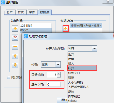 鼠標(biāo)選中序列生成的數(shù)據(jù)對(duì)象,點(diǎn)擊右側(cè)“處理方法”欄內(nèi)的+號(hào)按鈕,在彈出的“處理方法管理”窗口中,設(shè)置處理方法類型為“補(bǔ)齊”,目標(biāo)長(zhǎng)度為“5”,填充字符為“0”,設(shè)置完成后點(diǎn)擊添加即可。