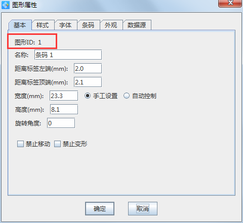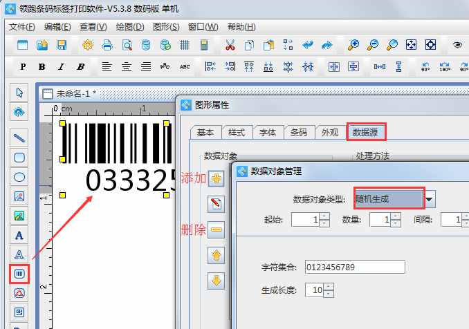 以二維碼引用條形碼的數(shù)據(jù)為例,首先需要先有條形碼,在畫布中繪制一個條形碼后,雙擊條碼進入屬性窗口,如下圖,記住條碼的圖形ID,在數(shù)據(jù)源選項中,先刪除默認數(shù)據(jù)對象后,然后添加新的數(shù)據(jù)對象,設(shè)置條形碼的數(shù)據(jù)為隨機生成。