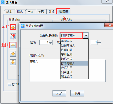 2、鼠標(biāo)右鍵選擇“屬性”,在彈出的屬性窗口中選擇“數(shù)據(jù)源”選項(xiàng),點(diǎn)擊左側(cè)“數(shù)據(jù)對(duì)象”欄中的減號(hào)按鈕,刪除默認(rèn)數(shù)據(jù)對(duì)象后,再點(diǎn)擊添加按鈕,添加新的數(shù)據(jù)對(duì)象。