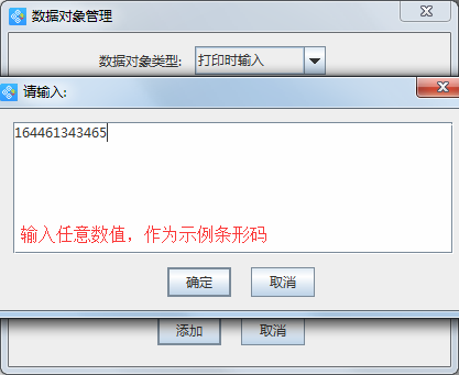 3、點(diǎn)擊下方添加按鈕后,會(huì)彈出“請(qǐng)輸入”的對(duì)話框,在該窗口內(nèi)輸入任意數(shù)值,輸入完成后點(diǎn)擊“確定”按鈕,示例條形碼制作完成。需要注意的是,此處輸入的內(nèi)容并不是要打印的條碼內(nèi)容,而是作為樣標(biāo)條碼以便調(diào)整條碼的位置,真正要打印的條碼內(nèi)容是已有條碼本身的數(shù)據(jù)。