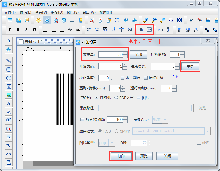 4、示例條碼制作完成后,通過(guò)利用軟件上方的排版工具對(duì)條碼進(jìn)行居中設(shè)置,然后點(diǎn)擊“打印設(shè)置”按鈕,在彈出的“打印設(shè)置”窗口中,輸入要打印的數(shù)據(jù)量后,點(diǎn)擊“尾頁(yè)”更新一下頁(yè)碼,設(shè)置完成后,點(diǎn)打印按鈕。